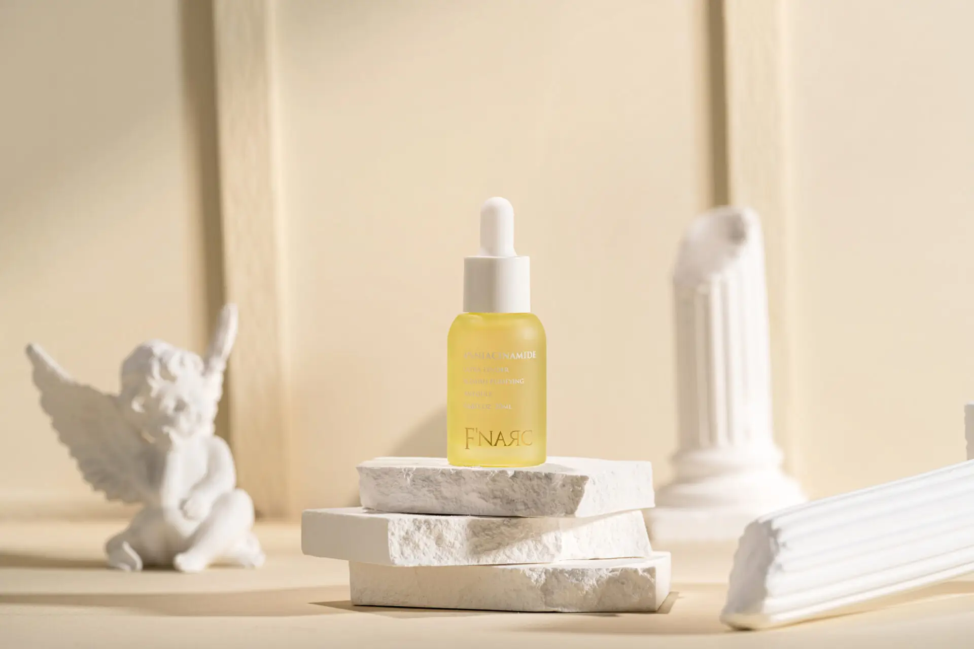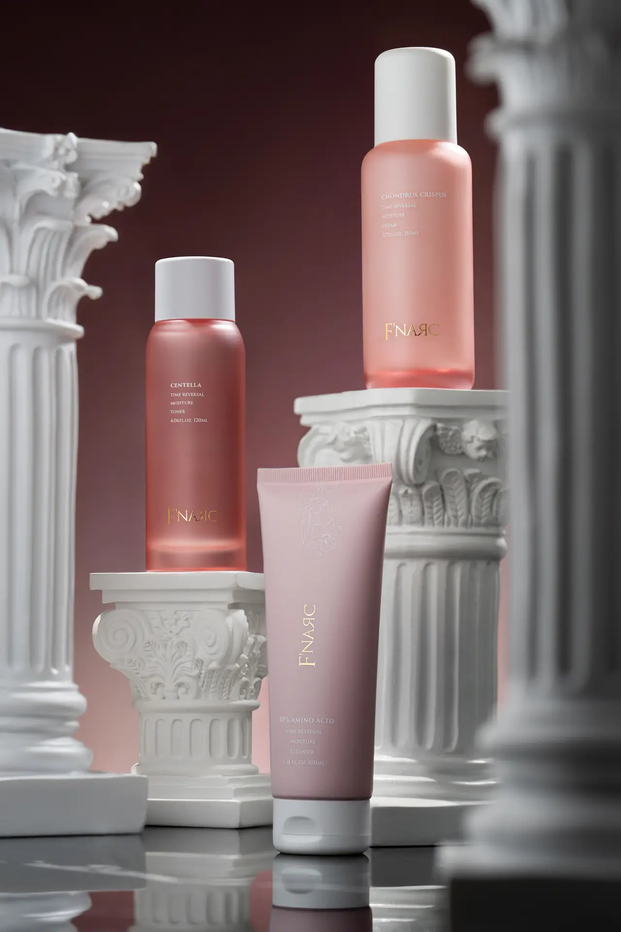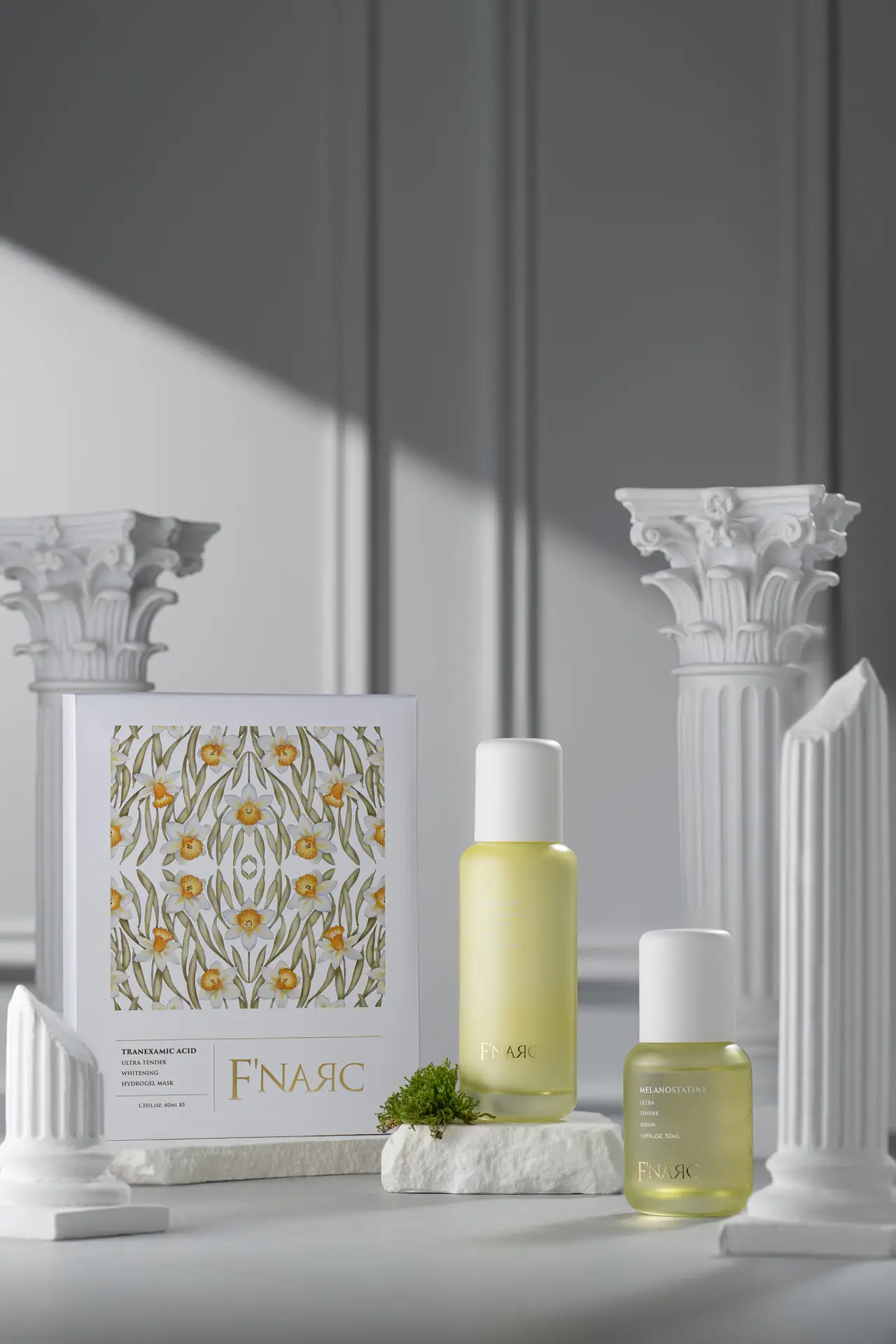Inspired by the timeless grace of European galleries, we envisioned two distinct moods for F’NARC’s signature skincare lines—